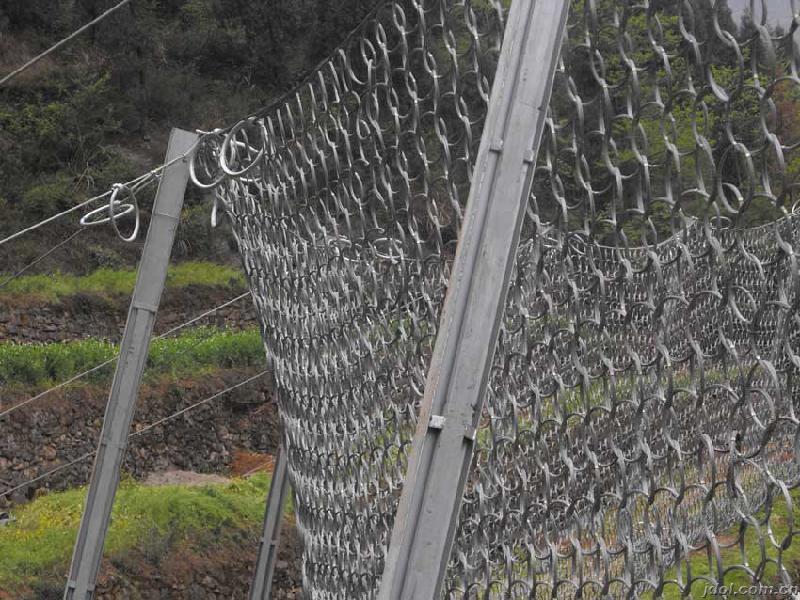 材質(zhì):鋼絲繩網(wǎng)、支撐繩和減壓環(huán)構(gòu)造:由鋼絲繩網(wǎng)或環(huán)形網(wǎng)(需攔截小塊落石時附加一層鐵絲格柵)、固定系統(tǒng)(錨桿、攔錨繩、基座和支撐繩)、減壓環(huán)和鋼柱四個主要部分構(gòu)成。