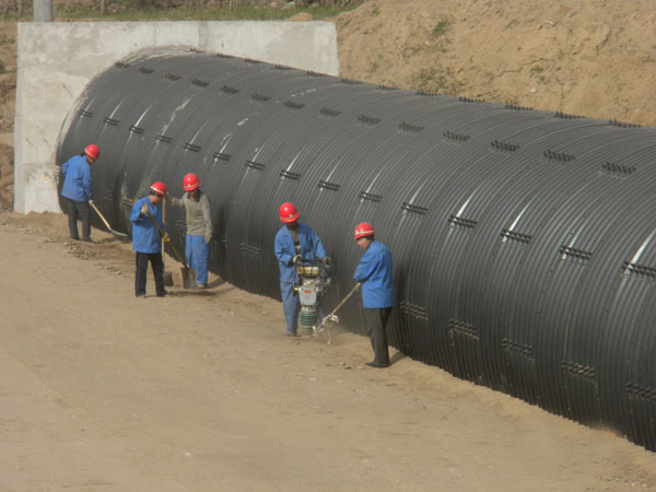 普通土地段,由于鋼波紋涵管為金屬結(jié)構(gòu),其適應(yīng)變形能力較強(qiáng),采取砂礫基礎(chǔ),基礎(chǔ)厚度≥0.6m;地質(zhì)不良地段,采取砂礫基礎(chǔ),基礎(chǔ)厚度≥0.6m,且基礎(chǔ)底部應(yīng)換填砂礫,厚度應(yīng)根據(jù)計(jì)算滿足基底承載力要求,防止引起過(guò)度沉降;巖石地基,基礎(chǔ)采用級(jí)配砂礫,基礎(chǔ)厚度≥0.3m;在軟土地區(qū)、多年凍土地區(qū)、膨脹土地區(qū)等處采用混凝土基礎(chǔ)。在寒冷地區(qū),基礎(chǔ)材料最好采用有一定級(jí)配的天然砂礫,最大粒徑不超過(guò)50mm,0.074mm以下粉粘粒含量不得超過(guò)3%,以滿足施工的壓實(shí)要求、填料最小強(qiáng)度要求、最大粒徑要求和地基基礎(chǔ)的抗凍要求。換填深度一般根據(jù)當(dāng)?shù)貎錾畹却_定。設(shè)置構(gòu)造物地基要盡可能避開(kāi)柔軟層與巖石的交界處,當(dāng)無(wú)法避開(kāi)時(shí),柔軟區(qū)間要用級(jí)配良好的砂礫仔細(xì)夯實(shí)(厚度大于0.6m),巖石區(qū)應(yīng)開(kāi)挖至少0.3m后用砂礫松鋪,以減小相對(duì)變位?紤]到地下水及其影響,建議在非凍地區(qū)也采用砂礫基礎(chǔ)。一般,在某些地區(qū)砂礫材料稀少或砂礫級(jí)配較差時(shí),也可換填碎石、礫石或河(山)砂及碎石土,但應(yīng)滿足壓實(shí)要求、填料最小強(qiáng)度要求、最大粒徑要求和抗凍要求。