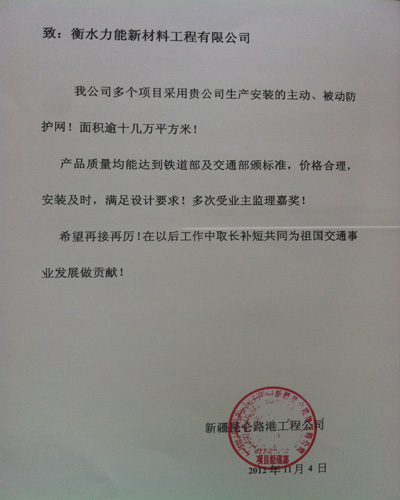 我公司多個項目采用貴公司生產(chǎn)安裝的主動、被動邊坡防護網(wǎng)!面積逾十幾萬平方米!