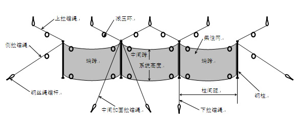 然后就可以安裝鋼絲繩網(wǎng)了,將鋼絲繩網(wǎng)通過縫合繩縫合在上下支撐繩與立柱上。然后進(jìn)行最后的調(diào)試工作,關(guān)于菱形被動(dòng)柔性防護(hù)網(wǎng)的安裝就基本完成了。