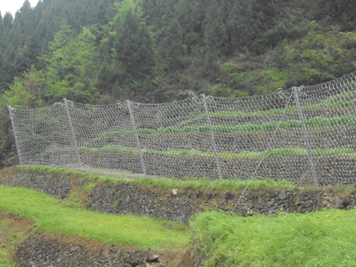 常用規(guī)格:[鋼柱(間距10M),帶消能環(huán)的∮16雙支撐繩和∮16“人”字形上拉錨繩(每跨6個消能環(huán)),∮16側(cè)拉錨繩(單繩),DO/08/300/5*5㎡鋼絲繩網(wǎng),∮8縫合繩,格柵網(wǎng)]
